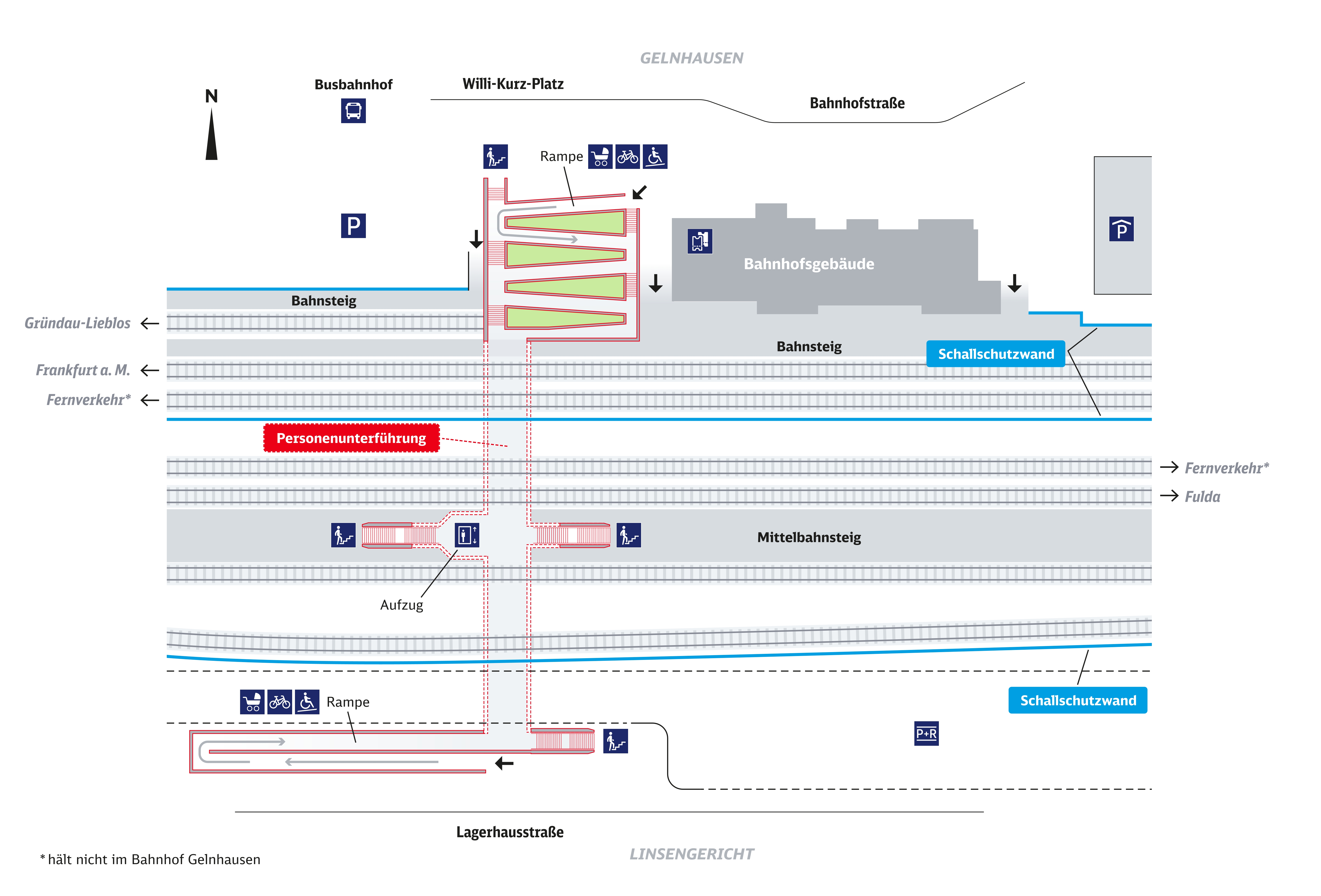 Auf beiden Seiten (Nord = Bahnhofsgebäude und Süd = Park&Ride-Parkplatz / Linsengericht) wird die Unterführung mit Treppen und zusätzlich mit Rampen ausgestattet. Der neue Mittelbahnsteig wird zukünftig durch Treppen und zusätzlich über einen Aufzug barrierefrei erreichbar sein.