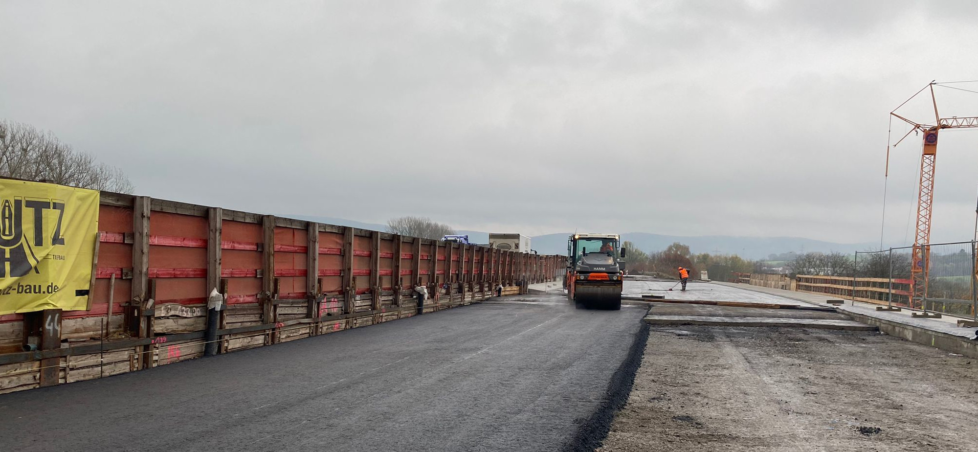 Bereits Ende des Jahres wurden auf der neuen Brückenhälfte der Autobahn A66 (Fahrtrichtung Fulda) die ersten Asphaltschichten aufgetragen. Ab Januar 2023 werden die Arbeiten fortgeführt. Unter anderem wird an der Bauwerksentwässerung sowie an den Böschungstreppen weitergearbeitet.