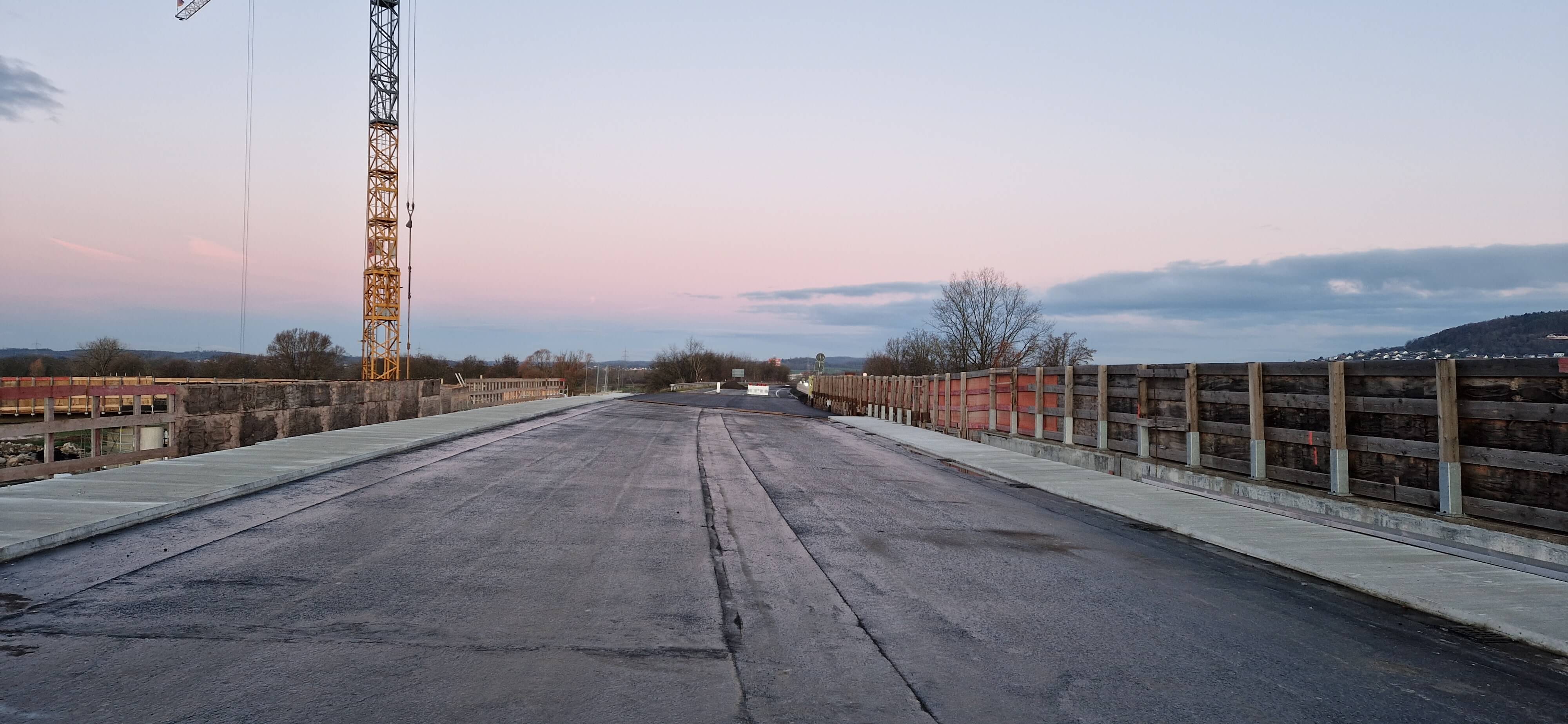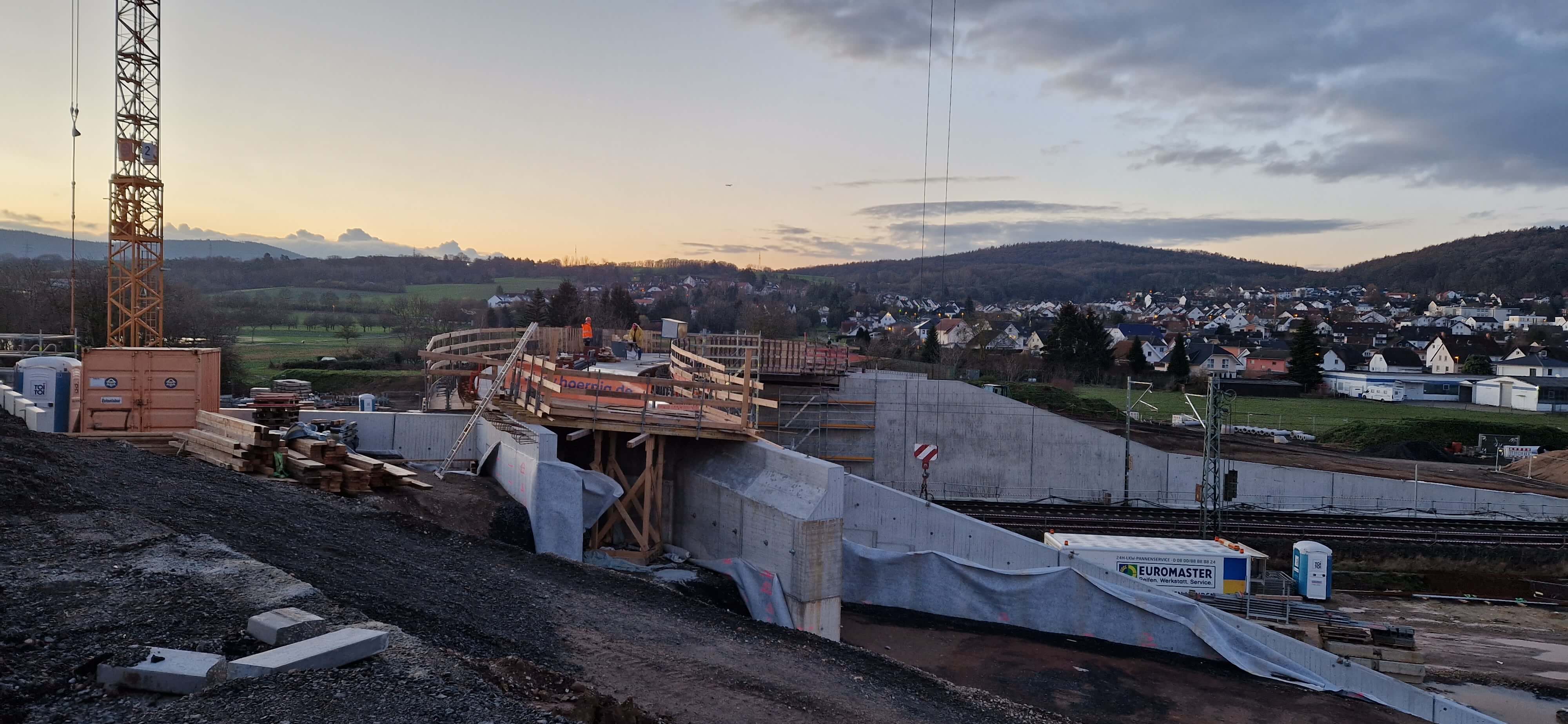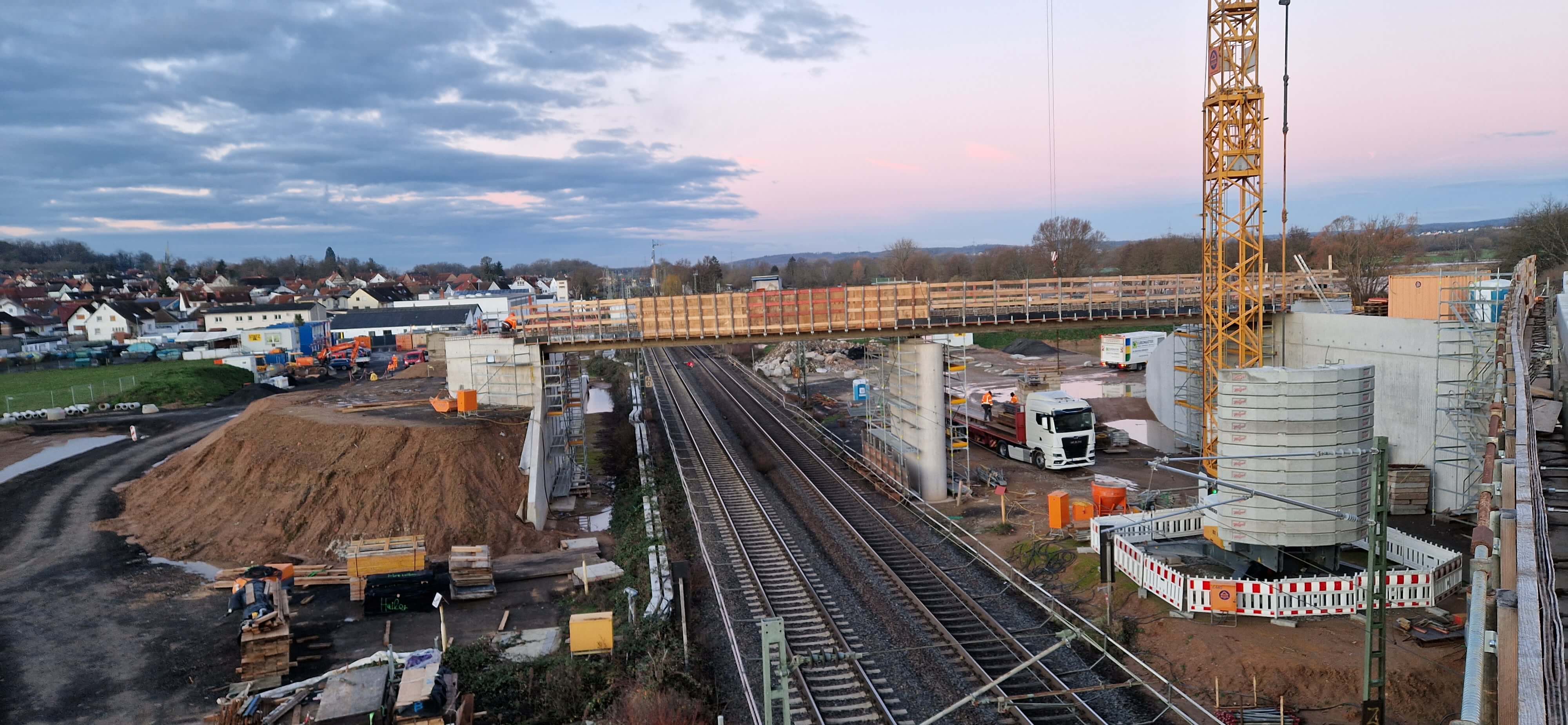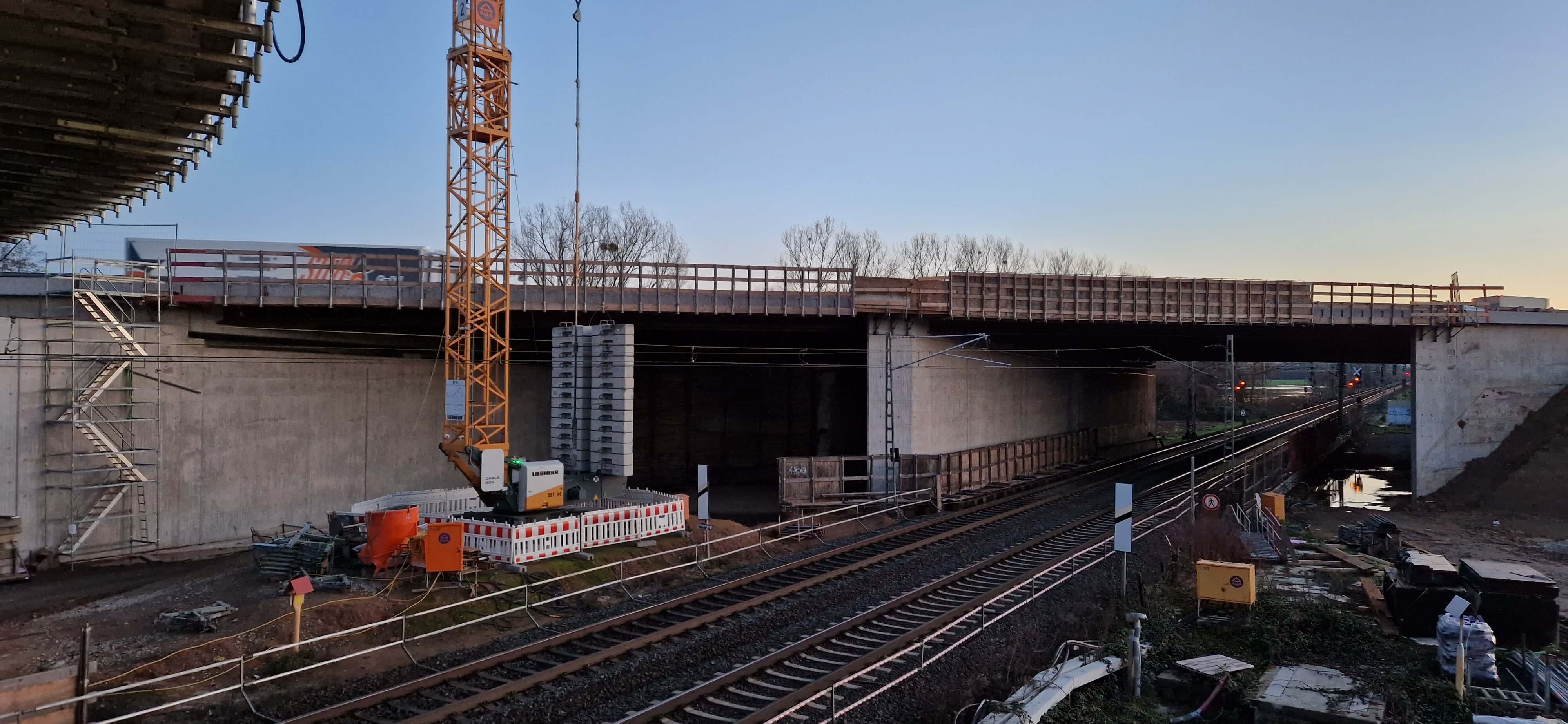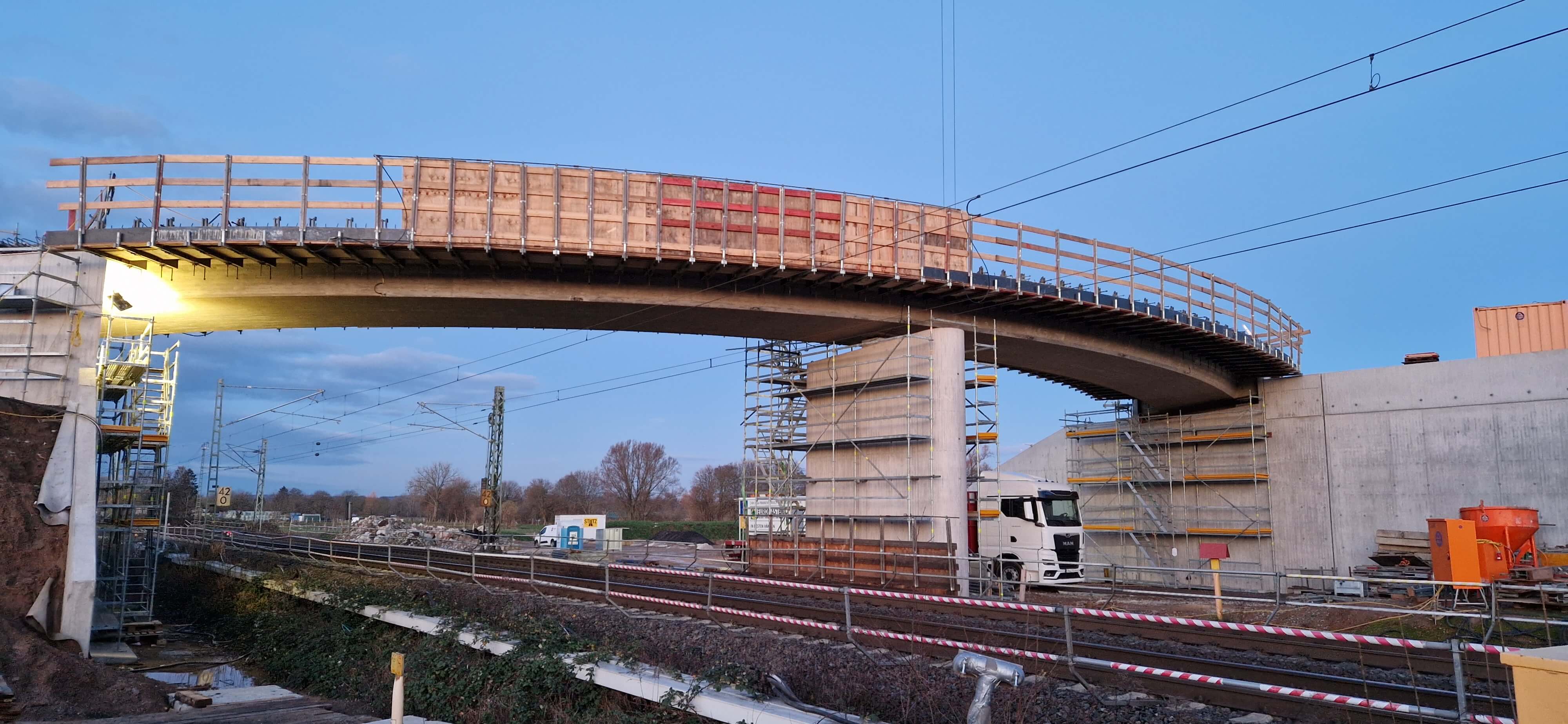 An der Wirtschaftswegbrücke konnte während einer Sperrpause im Dezember 2022 das Traggerüst ausgebaut werden. Im Nachgang wurde der Überbau mit hydraulischen Pressen auf Endhöhe abgesenkt. Im nächsten Schritt werden die Übergangskonstruktionen eingebaut und mit der Herstellung der Randkappen begonnen.