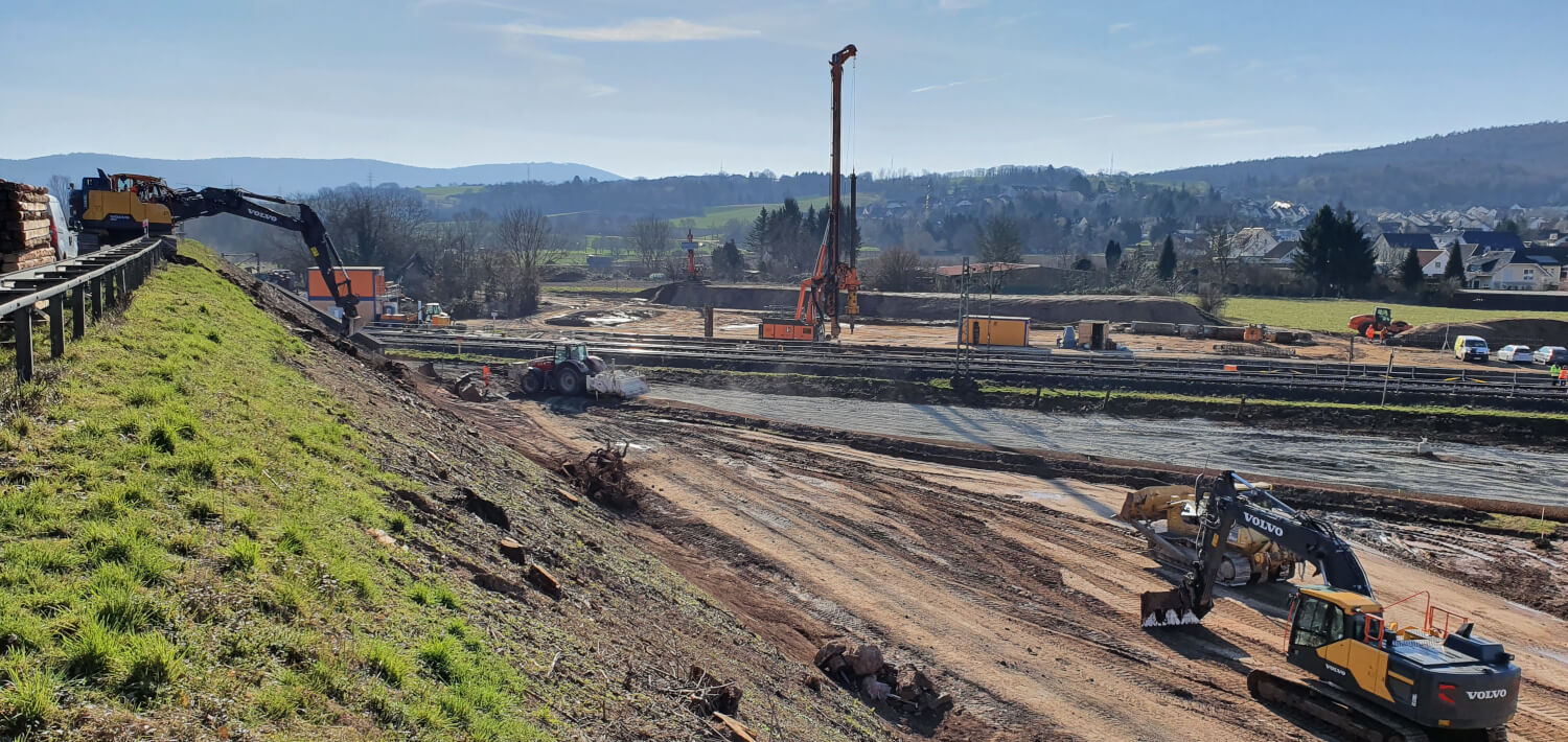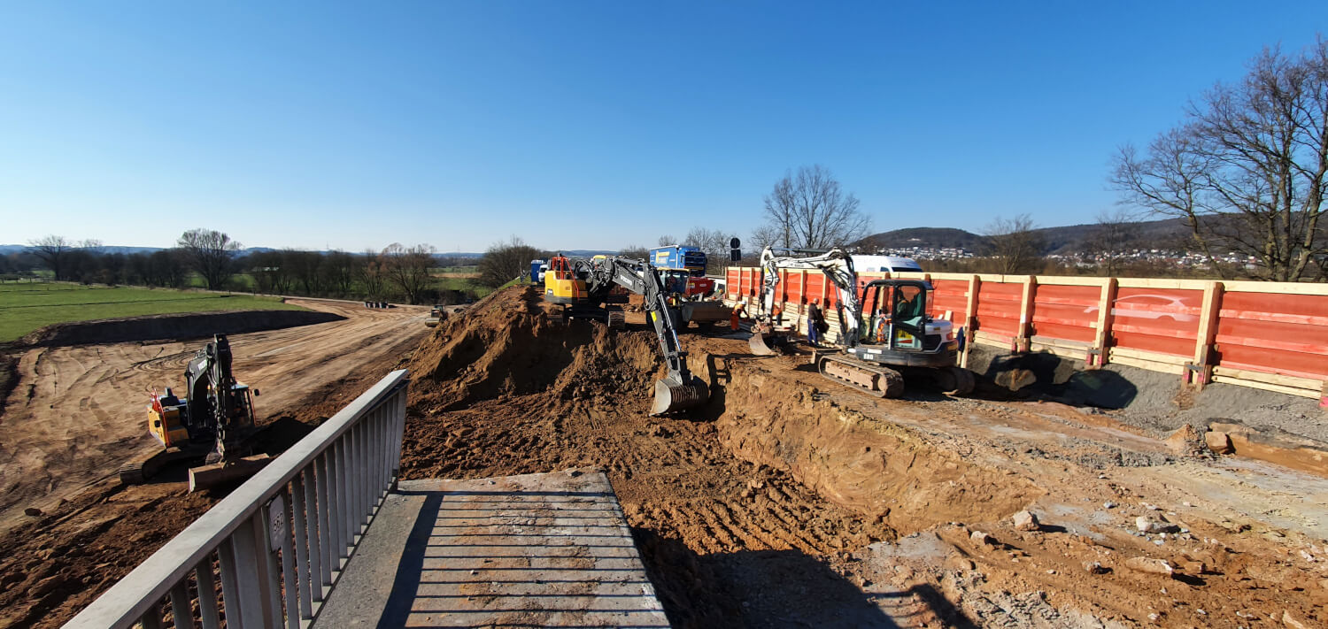 Für die Arbeiten der bevorstehenden Ostersperrpause wird das Baufeld an der Brücke der A66 bei Gelnhausen vorbereitet. Bagger und Baumaschinen kommen zum Einsatz um die Flächen zu begradigen. Die erste Brückenhälfte in Fahrtrichtung Fulda ist bereits gesperrt und wird ebenfalls für den Abriss vorbereitet. Der Verkehr auf der BAB A66 wird unter Beibehaltung aller Spuren in diesem Bereich bereits über die Gegenspur geführt.