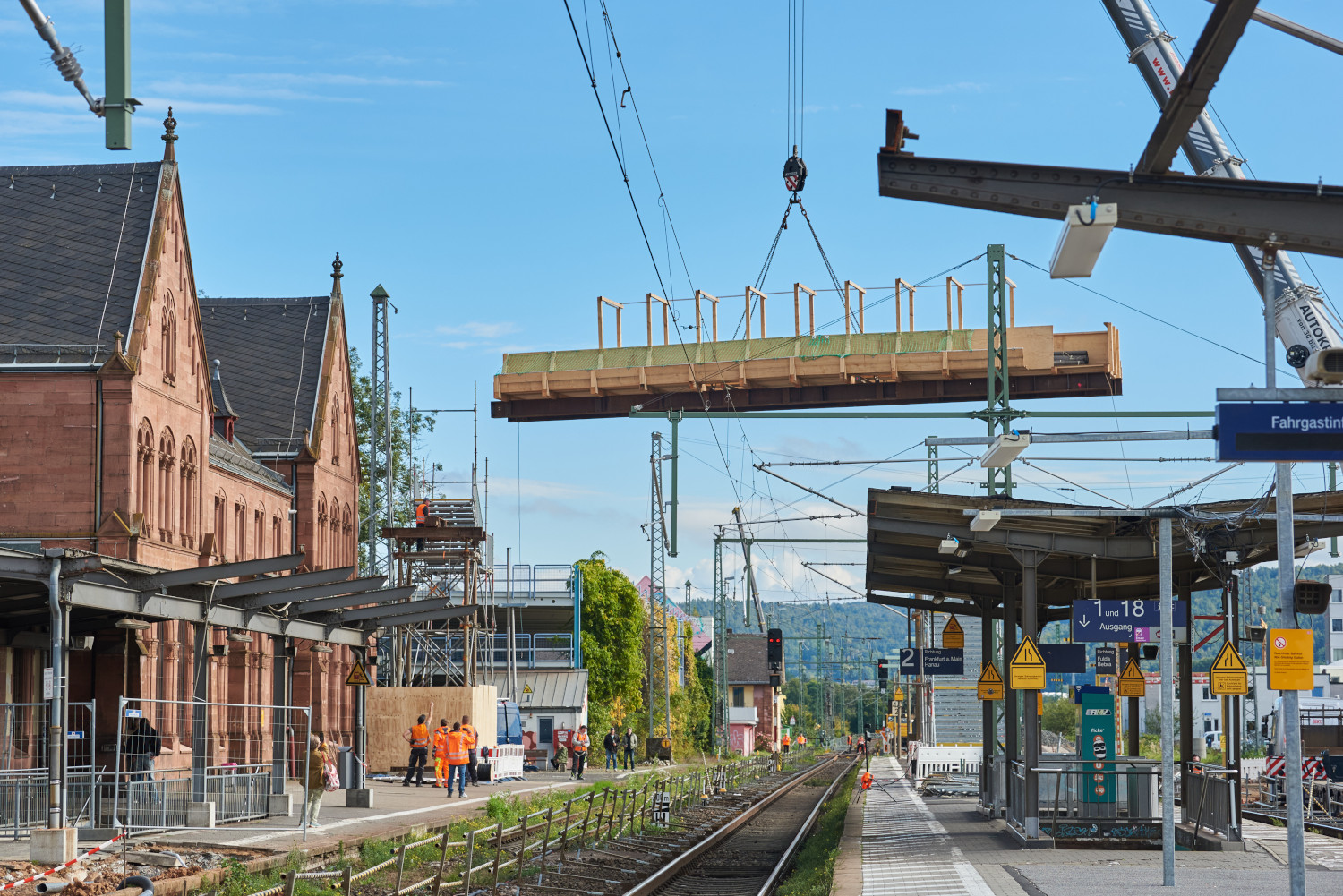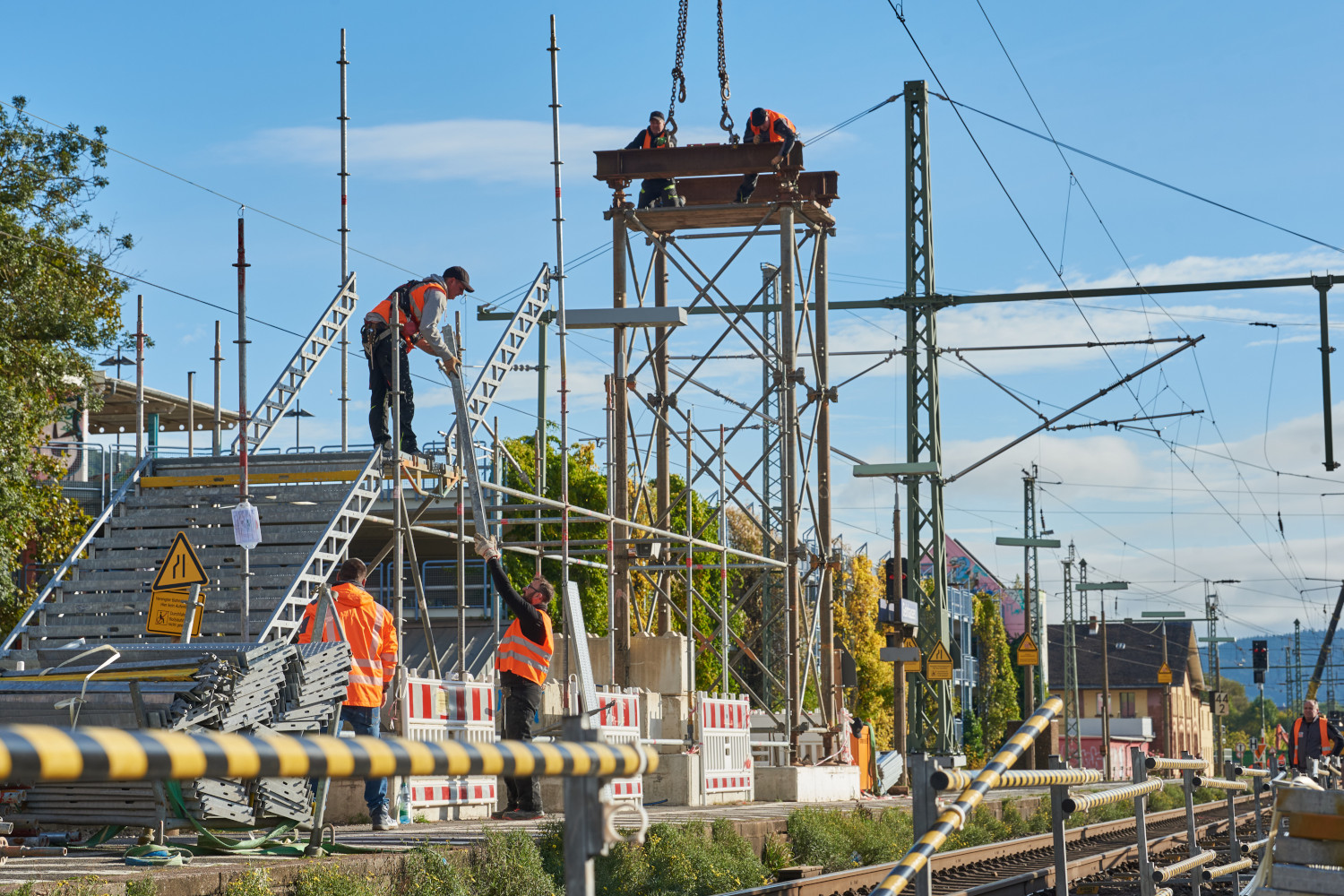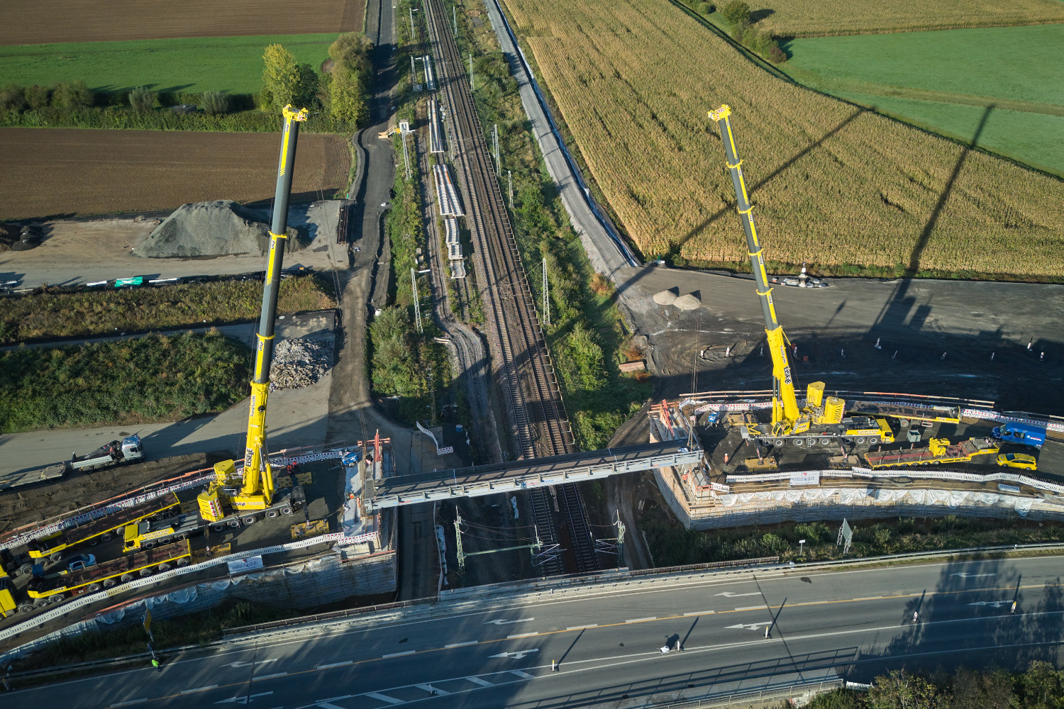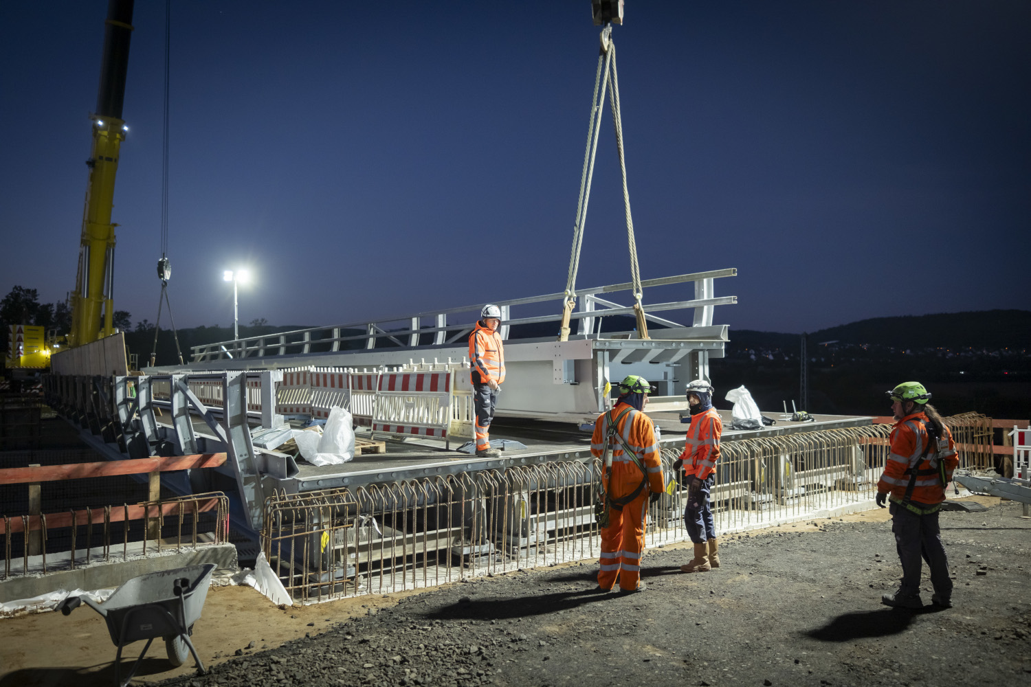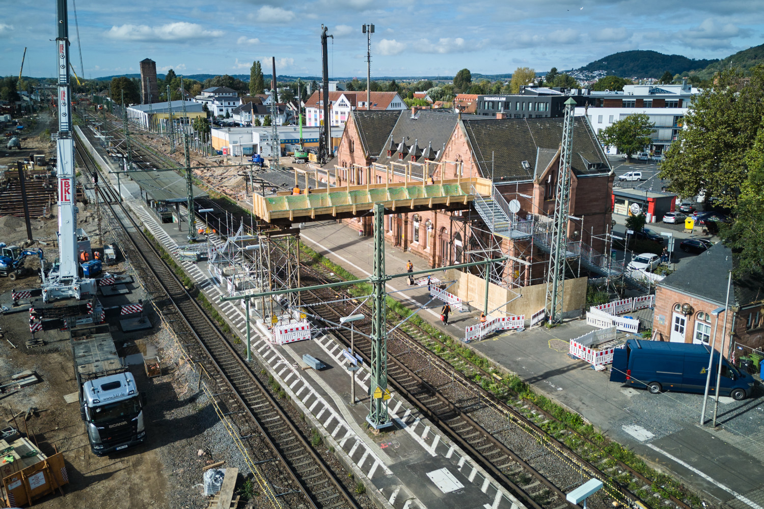 Am Bahnhof Gelnhausen wurde im Rahmen der Wochenendarbeiten mit Hilfe eines Krans die Fußgängerbrücke eingehoben und montiert. Gleich zwei Autokräne waren an der L3202 im Einsatz, um die Hilfsbrücke westlich der Bestandsbrücke einzuheben. So wurden einzelne Brückenelemente schrittweise eingehoben und miteinander verbunden. Zusätzlich fanden Arbeiten entlang der Gleise bis in die späten Nachtstunden statt.
