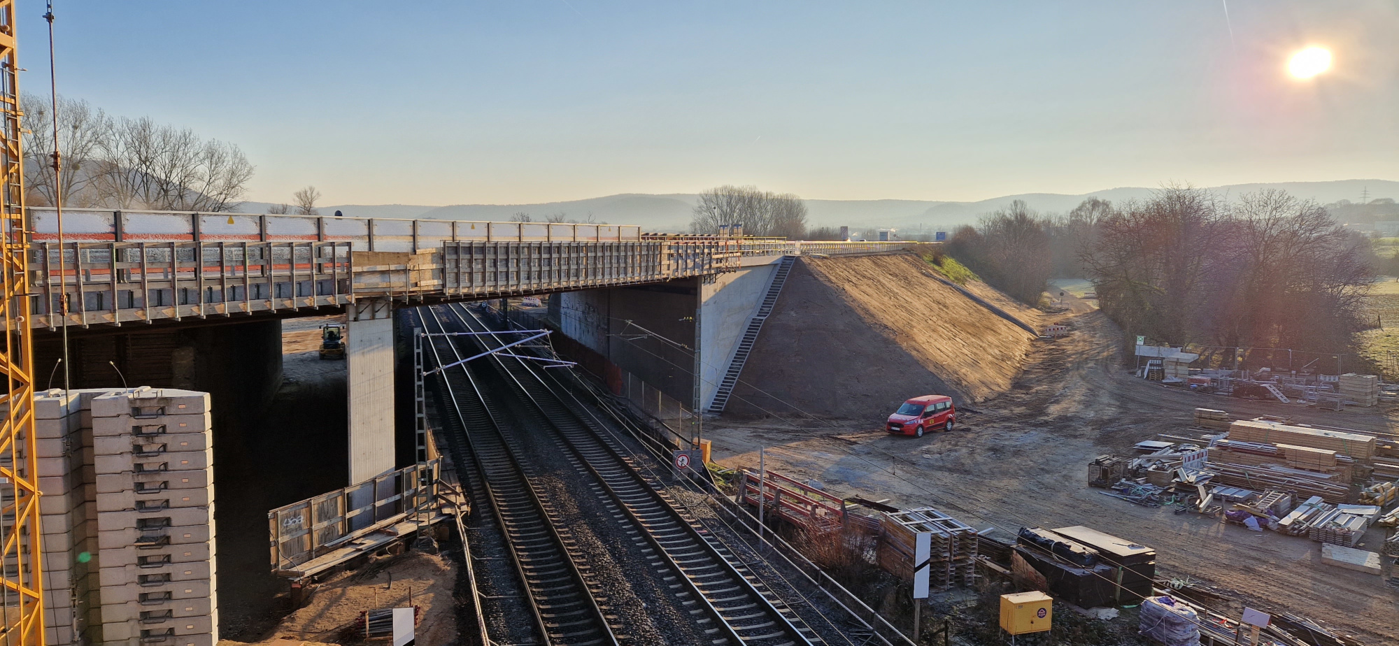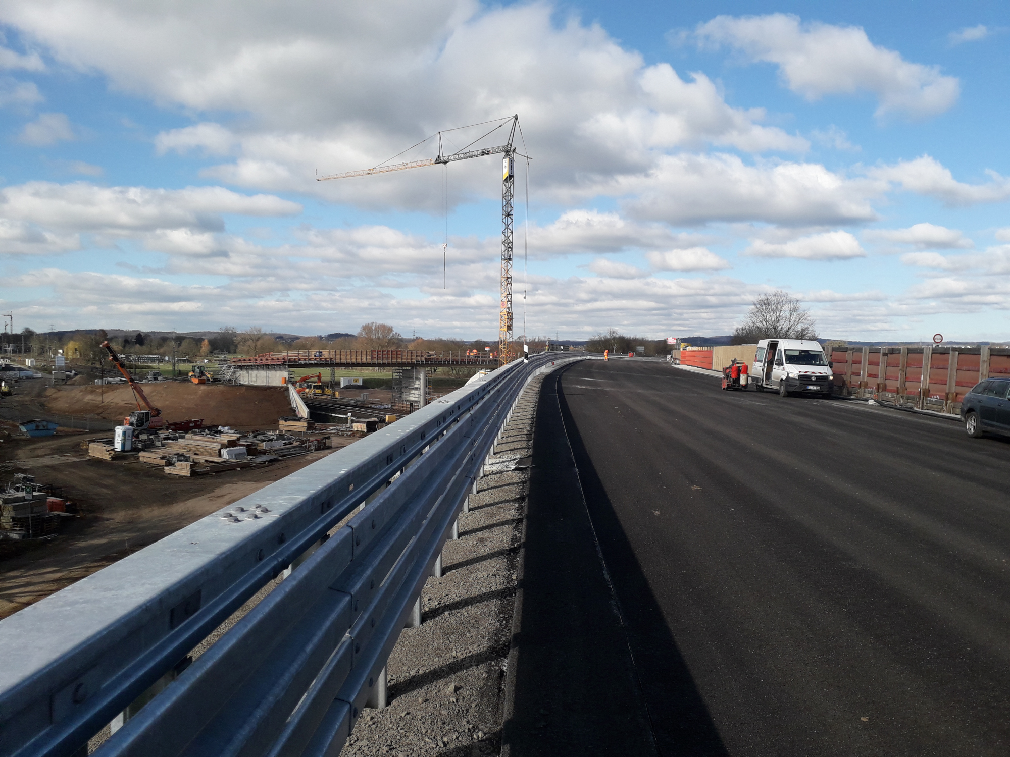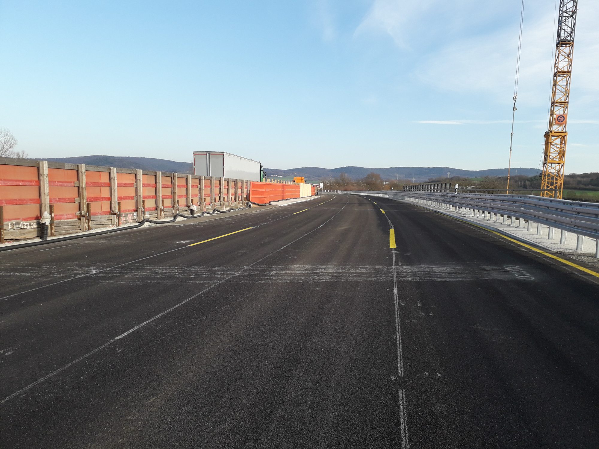 Pünktlich zum Monatsbeginn konnte die erste Brückenhälfte auf der Autobahn A66 in Fahrtrichtung Fulda für den Verkehr freigegeben werden. Zuvor wurde die finale Asphaltdecke aufgebracht und Leitplanken, Markierungen und weitere Schutzsysteme installiert. Im nächsten Schritt wird nun die Fahrbahn in Fahrtrichtung Hanau gesperrt und für den Abriss vorbereitet. Der Verkehr wird für die kommenden Monate unter Beibehaltung aller Fahrspuren über die neue Brückenhälfte umgeleitet.