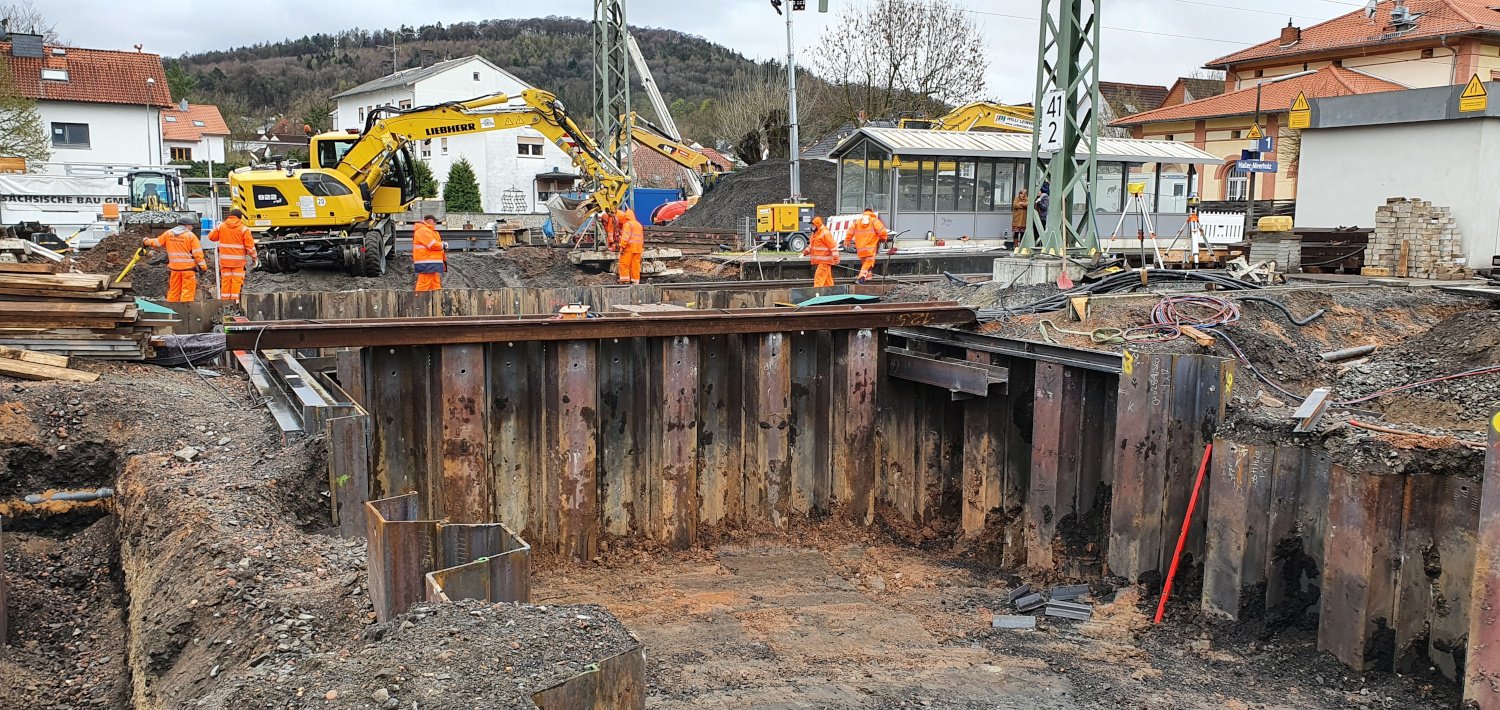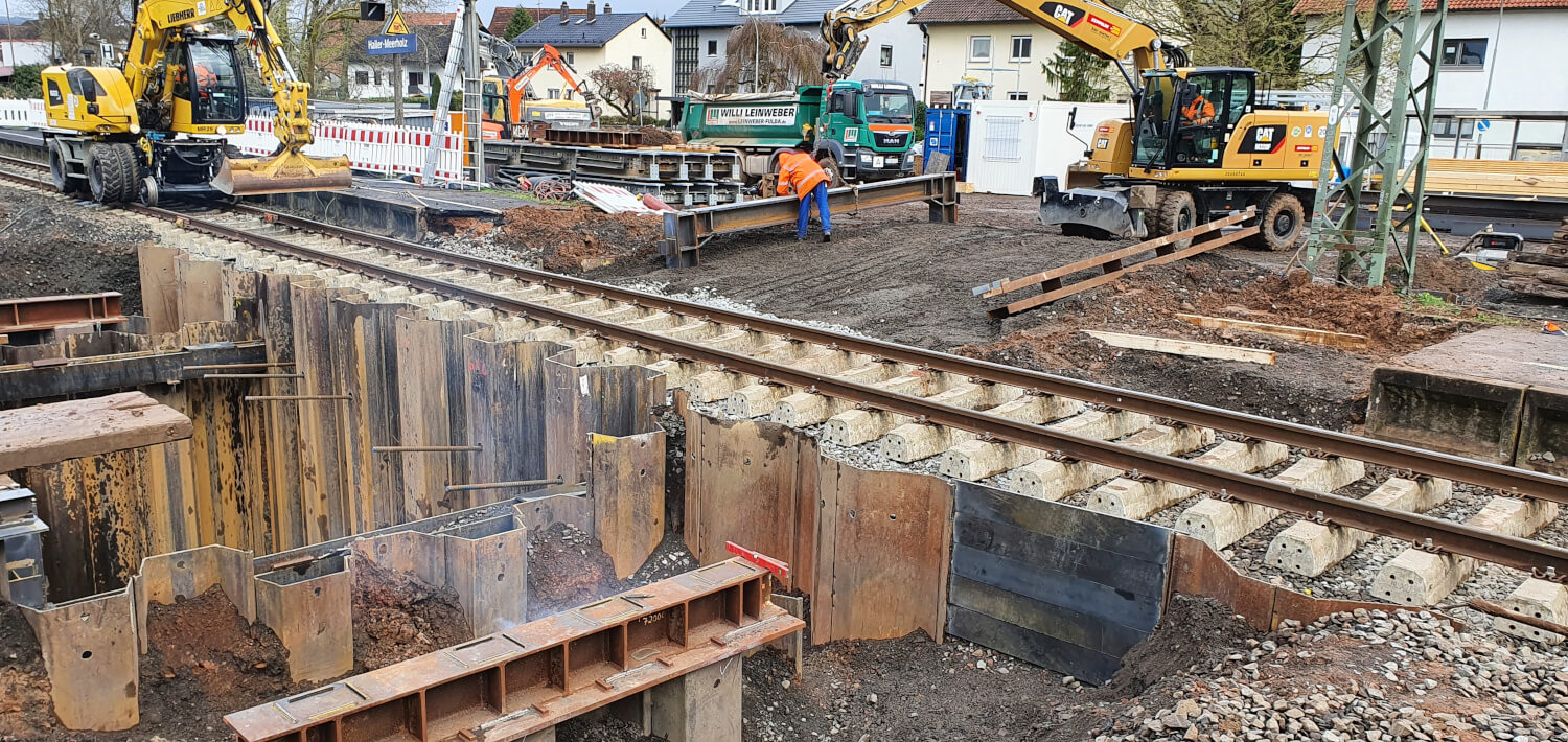 Um die Personenunterführung unter den Gleisen errichten zu können, ist der Einbau eines Verbaukastens zwingend erforderlich. Im Zuge der Ostersperrpause konnten notwendige Behelfsbrücken im Bereich des Verbaukastens eingesetzt werden.